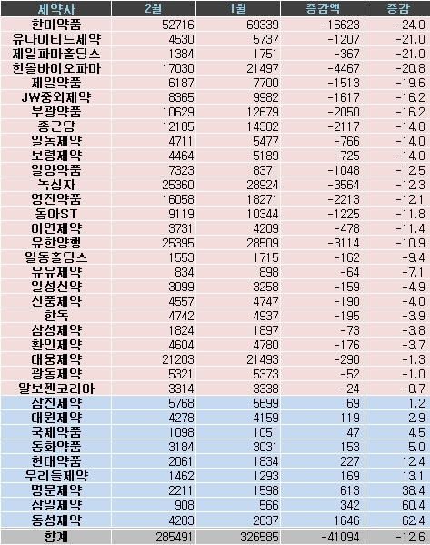 하락세가 가파른 제약사들 중 매출기준 상위 업체들이 많다는 점 역시 지켜볼 부분이다.