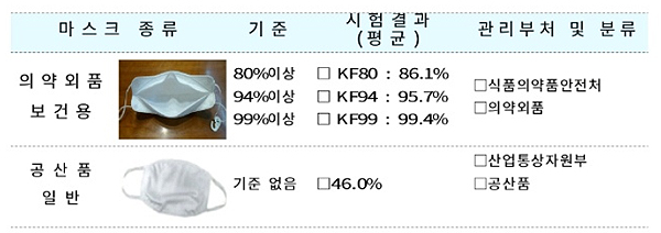 연구원은 "분진포집효율(미세먼지 차단 성능) 시험은 보건용 마스크 KF80 등급의 경우 평균 0.6㎛ 지름의 입자를, KF94 등급은 평균 0.4㎛ 지름의 입자를 생성해 실험하기 때문에 입자의 크기가 더 큰 미세먼지 PM2.5, PM10에 대해서는 훨씬 높은 차단 성능을 보일 것으로 예상한다"고 밝혔다. 그러나 공산품으로 나온 일반 마스크의 경우 분진포집효율 시험 결과 평균 46%에 그쳐 보건용 마스크에 비해 미세먼지 차단 성능이 낮은 것으로 확인됐다.