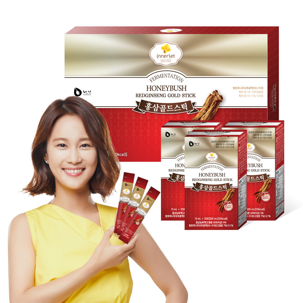 이너셋 허니부쉬 홍삼 골드 스틱(10ml*60포, 4만원대)은 휴온스의 피부 관련 특허 소재인 ‘발효허니부쉬추출물(HU-018)’에 국내산 6년근 홍삼농축액을 배합 했으며, 녹용, 당귀, 천궁, 황기 등 11가지의 귀한 원료를 정성스럽게 담아냈다.