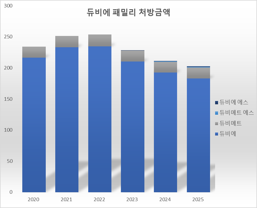 The market situation for Duvie is also not easy. Last year, outpatient prescription costs for the four types in the Duvie family totaled KRW 20.3 billion, a 3.9% decrease from the previous year. Duvie's prescription volume was KRW 18.3 billion, accounting for about 90%, while the remaining products were not significantly prominent. In 2022, Duvie and Duviemet combined for KRW 25.4 billion. Last year, the combined prescription amount of the four products decreased by 20.2% compared to three years ago.