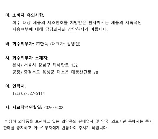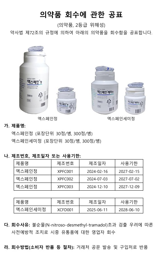 한독 '엑스페인정/엑스페인세미정' 회수
