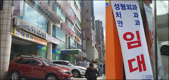 눈에 띄는 건 곳곳의 빈 상가와 점포, 기존 건물들에 내걸린 '점포 임대' 라는 현수막 뿐. 경영 압박을 견디지 못해 문을 닫거나 이전하는 성형외과들이 늘고 있다.