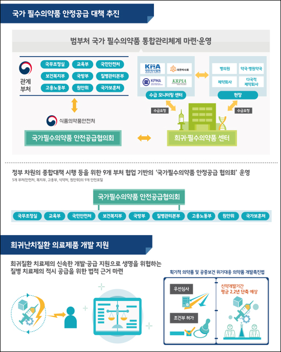 ◆희귀·필수 의약품 안정공급 기반 마련=희귀·필수 의약품 안정공급을 위해 정부 차원 통합관리체계를 운영하고, 희귀난치질환 의료제품 개발을 지원한다.