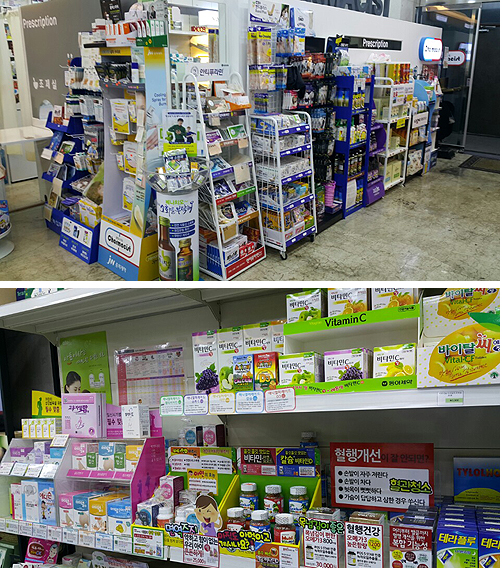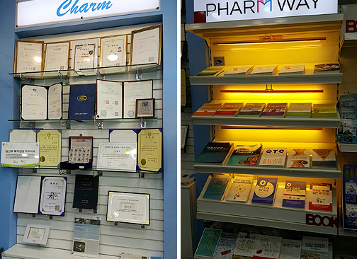 참약사약국 투약대 밖 공간은 제약사가 제공하는 진열대들의 전시장이라 해도 과언이 아니다. 약국 벽을 채운 진열장에는 제약사가 자사 제품을 홍보하기 위해 약국에 제공하는 크고 작은 진열대들을 적당한 크기에 맞춰 진열해 놓았다.