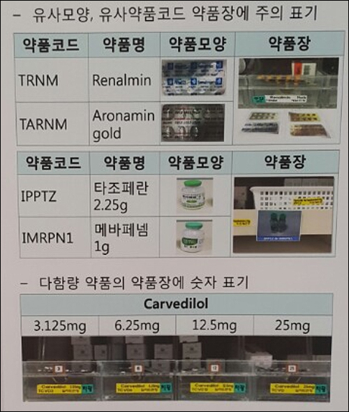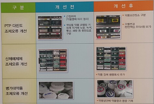 약제팀은 다빈도 조제오류 약품에 구분 색띠 등을 적용해 혼동 사항을 표시하고, 외용제 다빈도 조제오류는 별도로 공지하고 있다. 또 유사 모양 주사제는 구분을 위해 포스터를 제작해 홍보하고 신약 도입 시 기존에 사용 중인 약품과 유사점에 대해 약사들에게 미리 공지하고 있다.