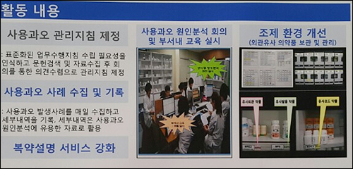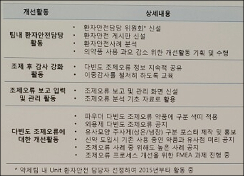약제팀 내 환자안전담당 위원회를 신설하고, 관련 게시판을 만들어 관련 내용을 공유하며 환자안전사례 분석, 의약품 사용 과오 감소를 위한 개선활동을 기획, 수행하도록 했다.