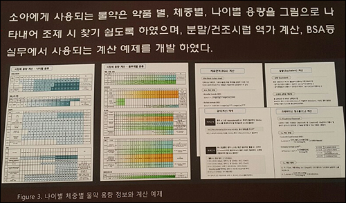 소아에 사용되는 물약의 경우 약품 별, 체중 별, 나이 별 용량을 그림으로 나타내 조제 시 찾기 쉽도록 하고 분말, 건조시럽은 역가계산, BSA 등 실무에서 사용되는 계산예제를 개발해 실었다. 이 밖에도 조제오류 방지를 위한 선배 약사들의 실전 팁도 수록됐다.