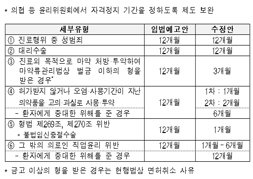 세부내용을 보면, 먼저 자격정지기간은 당초 모든 비도덕적 진료행위를 12개월 이내의 범위에서 자격정지하도록 일괄 상향 조정하기로 했는데, 이를 환자에 대한 위해 정도를 고려해 진료 중 성범죄, 대리수술 등 중대한 비도덕적 진료행위에 한정하기로 했다.