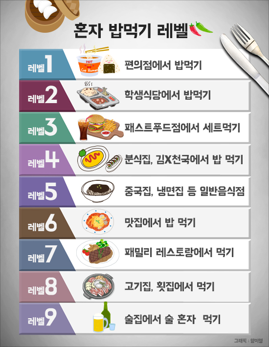 삼각김밥이나 컵라면 등 혼자서도 부담 없이 갈 수 있는 편의점이 1단계, 대학가 학생식당이나 푸드코트가 2단계, 패스트푸드점과 분식집이 각각 3, 4단계를 차지하고, 중국집, 냉면집 등 일반음식점은 5단계, 유명 맛집은 6단계, 다른 사람들의 시선이 신경 쓰이는 패밀리레스토랑, 고기집이 7, 8단계란다. '혼밥 고수'라는 9등급은 '술집에서 혼자 술 먹기'다.