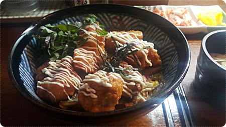 잠깐 개인적인 얘기를 하자면 일반적인 여성분들보다 혼밥을 두려워하는 편은 아니라고 자부한다. 혼밥 레벨로는 4단계 정도? 다만 혼자 가서 가장 아쉬운 점은 여러 개를 시킨 뒤 나눠먹을 수 상대가 없다는 정도였다. 고심 끝에 '가라아게동'을 주문하고 단무지와 김치는 담고 나니 금새 유부된장국과 주인공이 등장했다. 기다리는 시간이 길지 않기도 했지만, 바 좌석에는 혼자 식사하러 온 젊은 여성들이 서넛 있어 전혀 어색함을 느낄 수 없었다. 그만큼 맛도 분위기도 보장된 곳이다.