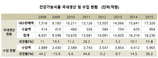 한국건강기능식품협회가 최근 발표한 국내 건강기능식품 시장 동향 분석에 따르면 건강기능식품 시장은 2008년 1조92억원에서 2015년 2조419억원으로 크게 성장했다.