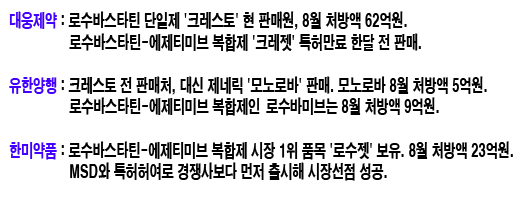 대웅제약은 오리지널 단일제인 '크레스토'가, 유한양행은 복합제와 제네릭약물인 '로수바미브'와 '모노로바'가, 한미약품은 복합제 '로수젯'이 최근 상승세를 타고 있다.
