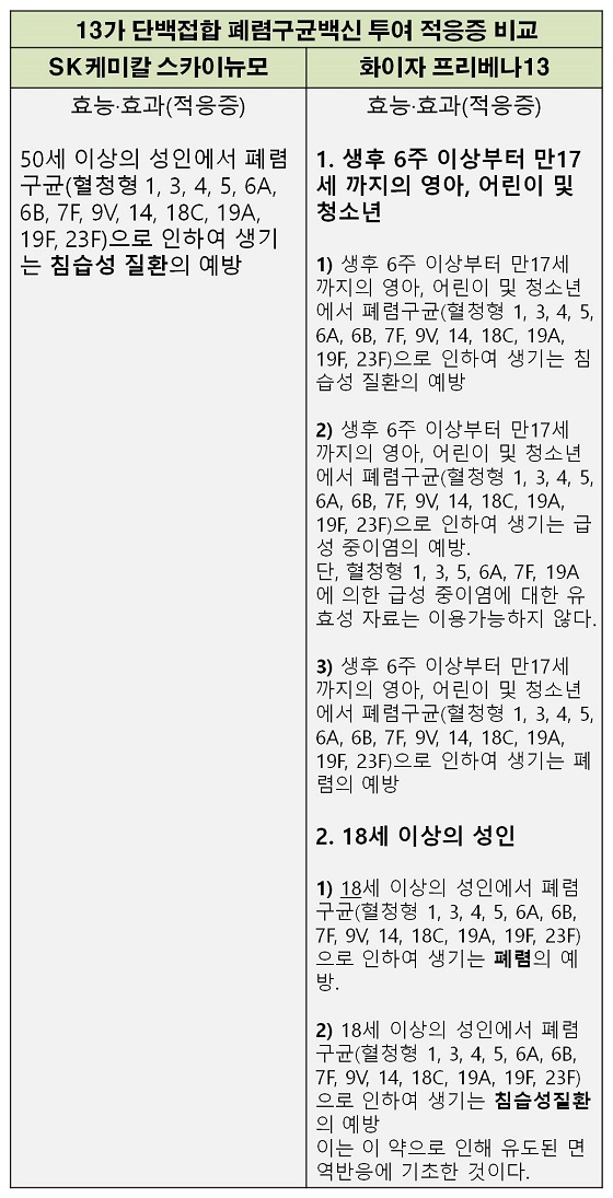 이중 성인 적응증만 놓고 볼 때, 스카이뉴모가 50세 이상 '폐구균 침습성 질환' 예방효과만 인정된데 비해 프리베나13은 18세 이상 전 연령대 성인의 '폐구균 침습성 질환'과 '폐렴' 예방 2개 효과를 인정받았다.