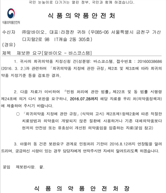 19일 식품의약품안전처는 "알바이오 측에 바스코스템 희귀약 지정신청 민원 관련 자료가 미흡해 28일까지 보완서류를 제출하도록 공문을 송달했다"고 밝혔다.