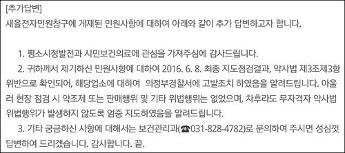 의정부보건소는 답변서에서 "민원이 제기된 A업체를 지도점검한 결과, 약사법 제3조 제3항 위반으로 확인됐다"며 "해당 업소에 대해 의정부경찰서에 고발 조치했고 차후 무자격자 약사법 위법 행위가 발생하지 않도록 엄중 지도했다"고 설명했다.