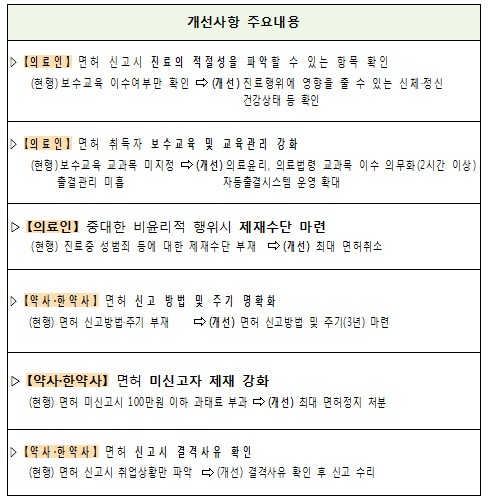 의료인은 면허 신고시 보수교육 이수여부 외에도 결격사유 발생여부를 추가 확인하고 약사·한의사도 면허 신고방법과 주기(3년)를 명확히 하는 등 신고제를 보완할 계획이다.