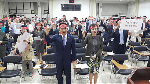 결국 시약사회는 분회장들과 협의해 결의대회 개최를 결정했다. 삼삼오오 모여든 약사들은 어느 새 200여명이 됐고 '약권수호'와 '국민건강'이라고 새겨진 붉은 머리띠를 두르고 결의대회에 동참했다.