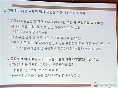 김 연구관은 "식약처는 이 경우 신속하게 대처해 의약품 허가, 생산될 수 있도록 지원하고 있다"며 "이 같은 감염병이 더 확산되고 있는 만큼 올해 중으로 더 많은 법적, 제도적 지원책 마련을 고려 중에 있다"고 말했다. 식약처는 우선 관련 제품 개발 단계별로 신속한 제품화를 위한 규정, 제도 등을 마련하겠다는 계획이다.