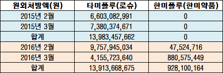 15일 제약업계에 따르면 지난 3월 한미플루는 8억8057만원(유비스트 기준)의 원외처방액을 기록했다. 2월 처방액 5752만원과 합치면 10억원에 가깝다.