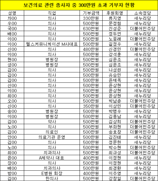 보건의약계 종사자 32명이 지난해 국회의원 후원회에 300만원 이상 정치후원금을 기부한 것으로 나타났다. 의사와 병원장으로 직업을 표기한 기부자가 대부분이었고, 약사는 1명에 불과했다. 기부받은 금액은 새누리당 윤상현 의원이 1500만원으로 가장 많았다.
