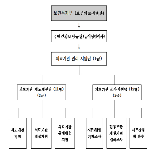 복지부와 건보공단은 이에 따라 급여상임이사 직속으로 1급을 단장으로 하는 '의료기관 관리 지원단(2팀, 6파트, 24명)'을 이번에 신설했다. 이를 통해 의료기관의 개설·운영을 적정하게 관리하고, 의료기관의 불법 행위를 신속하게 대응 할 수 있는 관리체계를 마련한다는 계획이다.