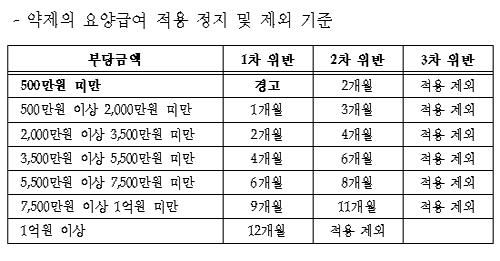 또 해당품목이 5년 이내 재적발되면 2개월의 급여정지 처분이 가중되는데, 이를 합산한 정지기간이 12개월을 초과하면 급여대상에서 제외된다. 금액과 상관없이 5년 이내 3회 적발되면 역시 퇴출된다.