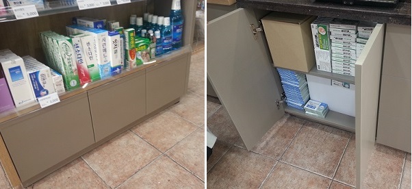 접수대 뒷면은 제품 진열 공간으로 사용하고 있다. 제품 보관보다는, 전시효과를 노린 배치로, 환자가 처방전을 내고 복약상담을 하며 가장 눈이 많이 가는 곳에 건기식 등이 보이도록 했다.