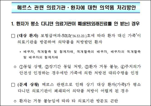 이에 따라 환자 대신 가족이 의료기관을 방문해 의약품을 처방 받아왔는데, 메르스로 환자가 평소 다니던 의료기관이 폐쇄됐을 경우 환자의 가족이 다른 의료기관을 방문해 처방을 받을 수 있도록 했다.