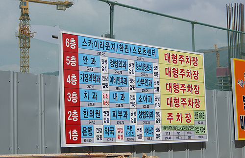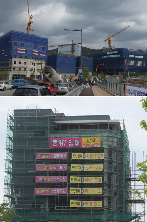 분주한 분양 사무소, 공사 현장마다 빠지지 않고 등장하는 것은 병의원 유치 현수막. 분양업자들의 최대 관심사 역시 병의원 원장 모시기에 초점이 맞춰져 있다.