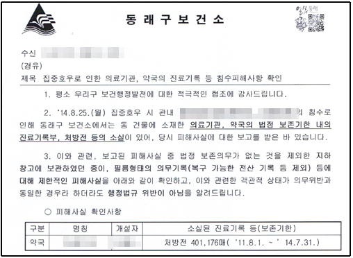 보건소는 이번 공문에서 "보고된 피해 사실 중 지하 창고에 보관했던 종이, 필름형태 의무기록 등에 대해 제한적인 피해 사실을 확인했다"며 "이와 관련한 객관적 상태가 의무위반과 동일한 경우라 하더라도 행정법규 위반이 아님을 알려드린다"고 밝혔다.