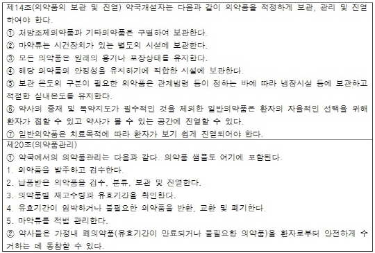 GPP 가이드라인안에도 유사한 조항이 있죠. '14조 의약품 보관 및 진열'과 '20조 의약품 관리'가 그것입니다. 하지만 이 조항은 약사법 내에 규정된 내용만을 담고 있어서 내용이 구체적이지 못합니다.