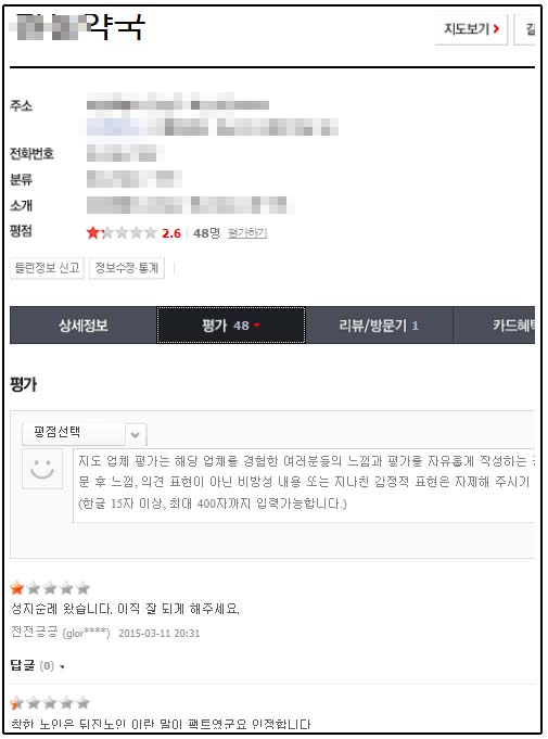 실제 네이버, 다음 등 주요 포털 사이트에서 특정 약국을 검색하면 해당 약국의 주소, 전화번호, 지도와 같은 상세정보 이외 평가란이 따로 마련돼 있다. 평가란에는 네티즌들이 자유롭게 해당 약국을 경험하면서 느낀점, 의견 등을 게재하도록 돼 있다.