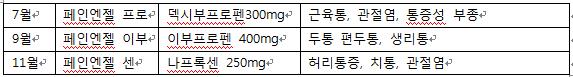 엔젤시리즈는 근육통·관절염·부종 등에 적응증을 가진 페인엔젤 프로(덱시부프로펜300mg), 두통·편두통·생리통에 효과가 있는 페인엔젤 이부(이부프로펜400mg), 허리통증·치통·관절염에 좋은 페인엔젤 센(나프록센250mg)으로 구성돼 있다.