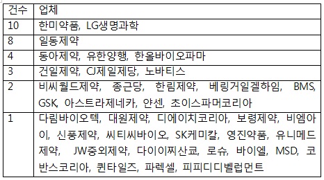 건수로 국내사가 63건으로 대부분을 차지했다. 또 외자사와 CRO는 각각 17건, 6건이었다.
