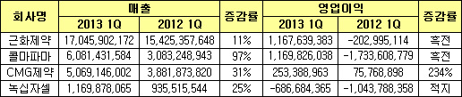 먼저 실적은 크게 나아진 것으로 조사됐다. 4개 회사의 1분기 매출과 영업이익을 비교한 결과, 모두 전년 동기 대비 실적이 올랐다.