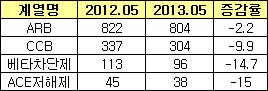 고혈압약물을 계열별로 살펴보면 ARB 5월 원외처방조제액은 전년 동기 대비 2.2% 줄었고, CCB는 9.9% 하락, 베타차단제 역시 14.7% 큰 폭으로 떨어졌다. ACE저해제 역시 15% 마이너스 성장했다.