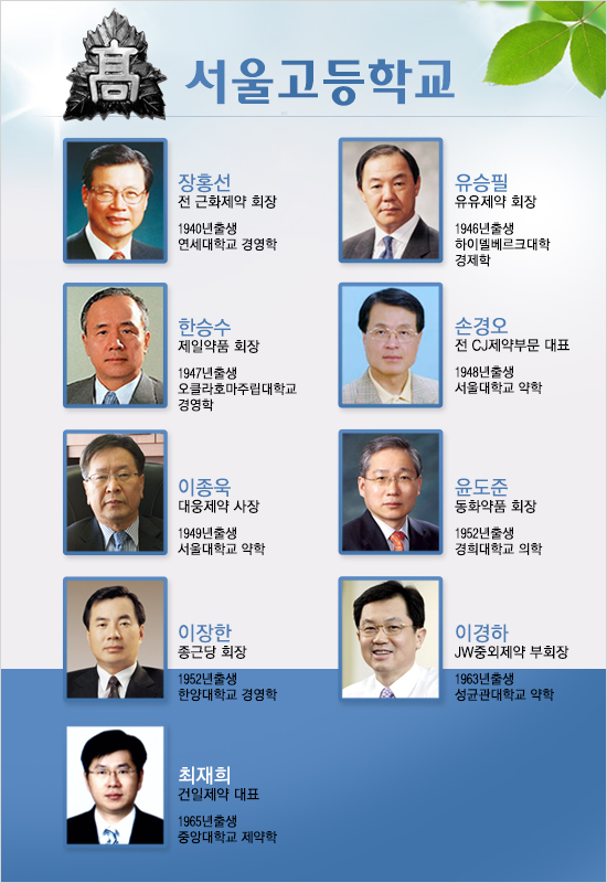 특히 서울고등학교 출신은 제약사 오너들이 상당수 포진하고 있다. 장홍선 전 회장을 포함해 윤도준 동화약품 회장, 이장한 종근당 회장, 한승수 제일약품 회장, 이경하 JW홀딩스 부회장 등이 모두 서울고 동문이다.