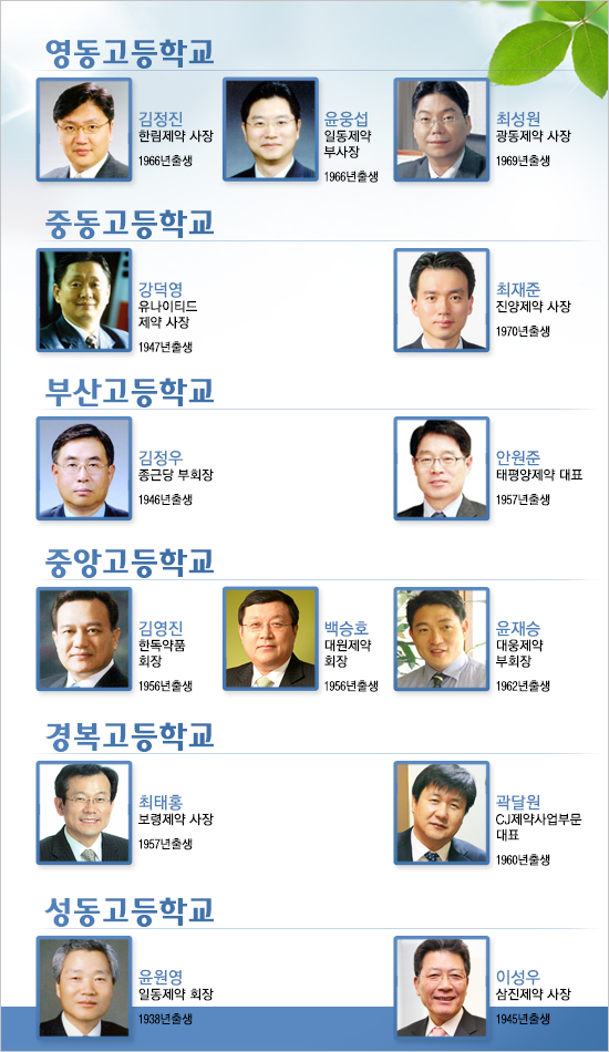 강덕영 유나이티드제약 사장과 최재준 진양제약 사장이 서울 중동고를 나왔고, 경복고 출신은 최태홍 보령제약 사장과 곽달원 CJ사업부문 대표가 3년차 선후배 관계로 나타났다.