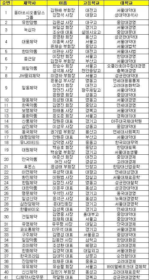 현직 완제의약품 제조업체 41곳 53명 대표들의 출신대학교를 조사한 결과, 서울대 출신은 15명으로 가장 많았다.