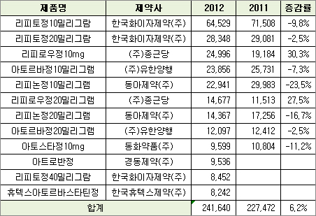 하지만 약가인하와 상관없이 청구액이 급증한 제품도 많다. 종근당 리피로우는 30% 성장해 오리지널 리피토 다음의 이름을 올렸고, 경동제약의 아토르반, 휴텍스제약의 휴텍스아토르바스타틴은 각각 96억과 82억의 청구액으로 전체 의약품 상위 300위에 새롭게 이름을 올렸다.