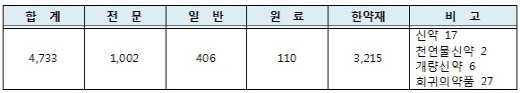 작년 의약품 허가(신고) 현황을 분석한 결과, 허가(신고)된 품목수는 4733개로서 2011년 8122개에 비해 42% 정도 감소했다. 허가 품목수 감소는 한약재가 2011년 6516개에 비해 지난해에는 3215개로 크게 감소했기 때문이다.