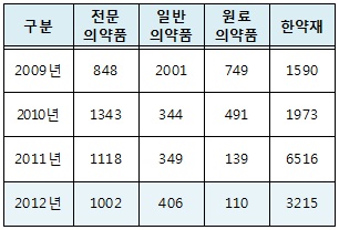 전문의약품의 허가 품목수는 2010년 1343개, 2011년 1118개, 2012년 1002개, 원료의약품은 2010년 491개, 2011년 139개, 2012년 110개로 줄었다.