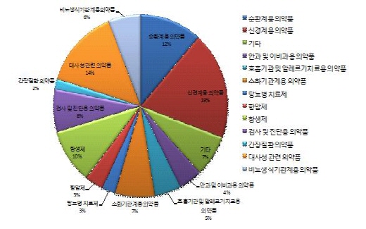 약효군 별로 분석한 결과 ▲해열·진통·소염제 등 신경계의약품(269개, 19%) ▲골다공증 치료제 등 대사성의약품(200개, 14%) ▲고혈압치료제 등 순환계의약품(162개, 11%) 순이었다.