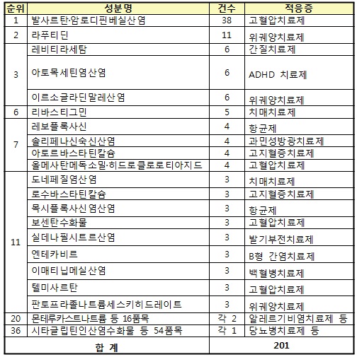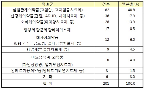 신경계의약품 36건, 소화계의약품 28건, 항생제·항균제·항바이러스제 17건 순으로 뒤를 이었다.