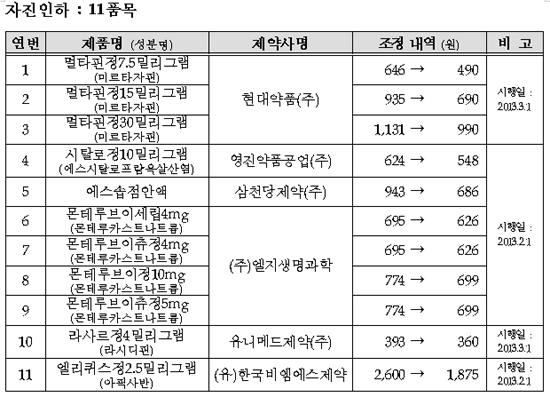 또 멀타핀정 3개 함량, 시탈로정10mg, 에스솝점안액, 몬테루브이세립4mg, 몬테루브이츄정4mg, 몬테루브이정10mg, 몬테루브이츄정5mg, 라사르정4mg, 엘리퀴스정2.5mg 등 11개 품목은 자진인하 형식으로 가격이 조정된다.