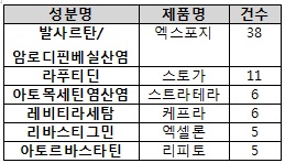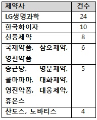 또 종근당, 명문제약, 대화제약, 제일약품, 대웅제약, 휴온스 등은 각각 5건을 승인받았다. 노바티스와 산도스는 각각 4건이었다.