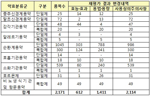 재평가로 인한 주요 변경 내용은 ▲효능·효과(612개) ▲용법·용량(1411개) ▲사용상 주의사항(2114개) 등이다.