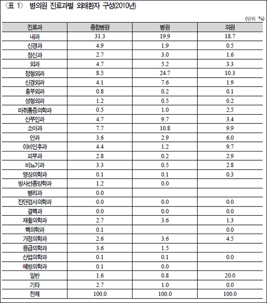 병의원을 이용하는 외래환자의 진료과목별 구성비가 의료기관 규모와 기능에 따라 차이가 나는 것으로 나타났다.