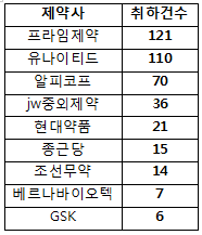 제약사별로 자진취하 건수가 가장 많았던 제약사는 121건을 기록한 한국프라임제약이었다.