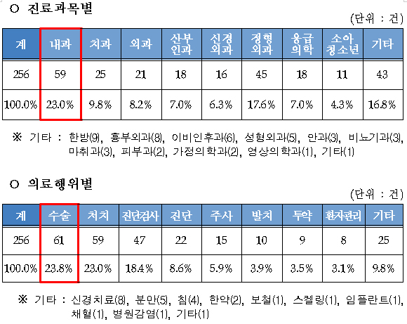 진료과목은 내과가 59건(23.3%), 의료행위별로는 수술이 61건(23.8%)으로 가장 많았다.